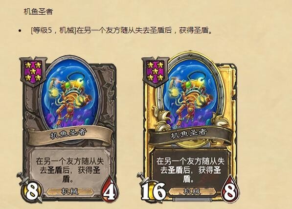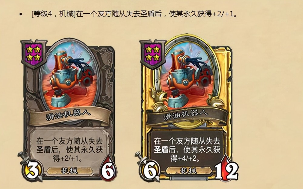 滑油机器人,其效果为在一个友方随从失去圣盾时获得+2+1的身材,金色后其效果直接翻倍。这是什么概念,只要补盾补得够多,一场战斗下来能涨多少身材就不用我多说了吧,而且身为一个机械能补多少次盾也不用多说了吧,最完美的阵型两个鱼哥互相补盾,后排滑油狂加BUFF,剧毒?你可能都打不到我的怪,还想打我的脸?当然除了这两张算是机械的绝对核心卡外,还有一两张娱乐性或者过度较为好用的卡牌。