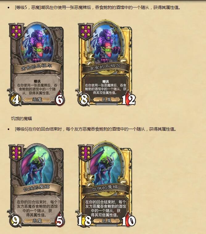 恶魔已经不满足吃自己家的随从了,终于对鲍勃的随从动手了!在新版本的恶魔卡牌其中两个能够吞噬鲍勃也就是酒馆刷新的卡牌,第一张是五星恶魔贪食的乌祖尔,其效果为玩家每一次打出一张恶魔则吞噬酒馆的一张随从,吸收其身材。不过要注意的是,吞噬的酒馆随从就木有了!!!有什么想买的随从一定要先行购买,不然一不小心可就买不到了。另一个则是六星恶魔饥饿的魔蝠,它的效果是每个回合结束后每个友方恶魔吞噬一名酒馆内的随从,不过也要注意一点,那就是酒馆最好是满随从,不然如果你满场恶魔,有的小朋友会分不到随从吃。