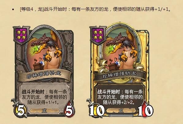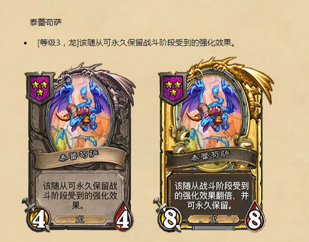 在本次更新中三星卡牌中推出了一张让龙族前期能够更好过度的龙族卡牌,它的名字就叫做——泰蕾苟萨,其效果就一句话的事情,该随从可永久保留战斗阶段受到的强化效果,配合上另一张新出的龙族卡牌珍惜增强幼龙的特效,每个战斗回合没有提一条龙对身边随从增加+1/+1的属性,在玩龙族卡牌时可以更有效的过度前期。