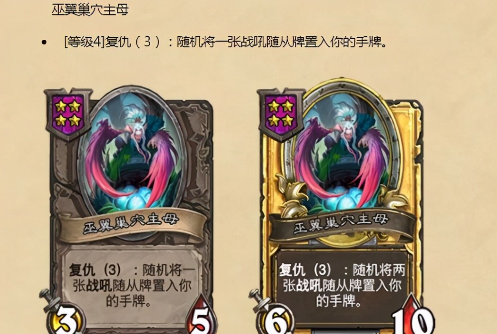 在了解卡牌之前,我们先来说一说新登场的词条“复仇”。词条这个东西相信大家不会陌生,每一个词条都代表着一个随从卡牌能够触发的效果,像以前的圣盾、剧毒、嘲讽这样的被动词条,还有需要一些条件触发的词条亡语、回合开始、回合结束、各种战吼等等,这些词条在原版的竞技模式下也是存在的,有的是因为战棋模式而做了些许更改,可全新的复仇词条仿佛就是为战棋模式独特设计的一样。