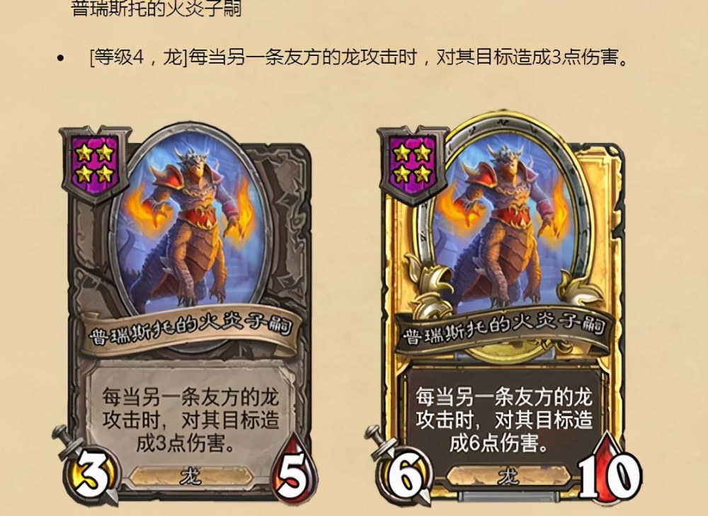 还记得之前玩大威天龙的时候除了小火龙、翻倍龙与圣盾龙有特效外,其余的随从基本上都是只有面板的傻大个,而在这次的全新版本中还有一条龙在培养后也能有效的增加整体龙族的强度,一张四星卡牌普瑞斯托的火炎子嗣这张卡,其效果为每次其他龙族卡牌攻击时对其攻击目标造成3点伤害,在破除圣盾有奇效,特别是后期融合怪林立的时候,一脚A上去先破盾在杀敌,完美表面了圣盾互换和被白嫖的命运。