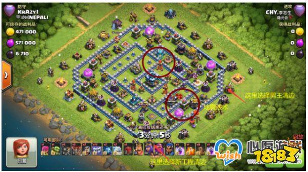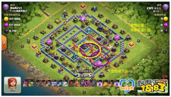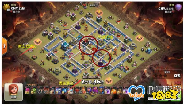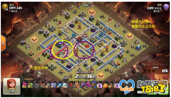 1.在阵型中选择城墙最为密集或者将核心建筑包裹住的两处城墙用地震打开。(简单可以理解为地震最合适的释放位置)这里要注意,8个地震可以开两波城墙,而两次开的墙切记要联通在一起,否则雪怪这个憨憨还是很容易砸墙。