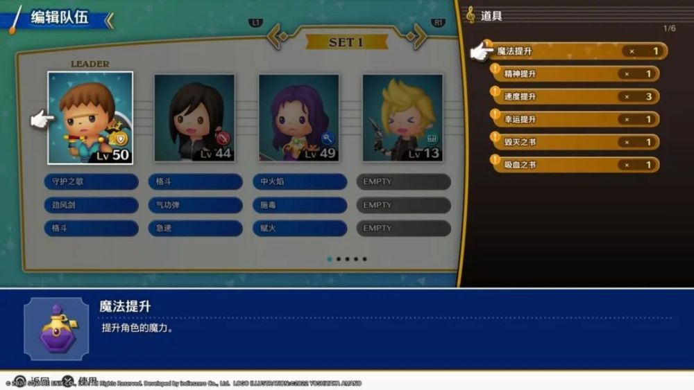 《最终幻想 节奏剧场》也有一定的RPG养成要素,主要体现在角色队伍的搭配组合,以及角色技能的选择使用。游戏中随着玩家完成系列游戏数量的增加,可以解锁新的角色加入至队伍之中,角色类型上也各不相同,有防御型也有攻击型,角色等级提升后可以学得新技能。无论是角色队伍的搭配,还是技能的装配都是玩家需要考虑的,不同系列游戏下的关卡有些各自的条件设定,想要获得高分又能完成关卡的任务,玩家还得根据实际情况选择合适的角色才行。