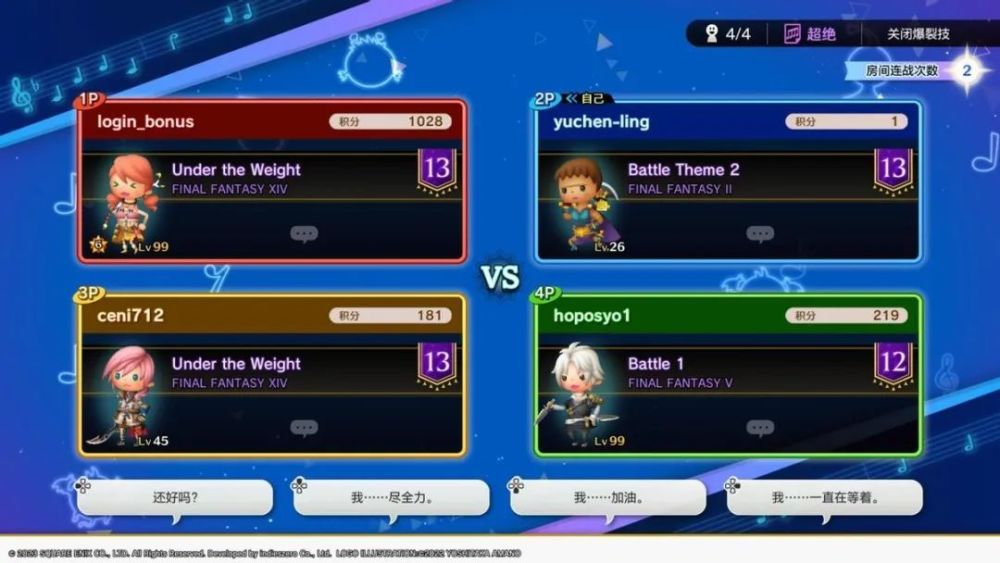 作为音游来说《最终幻想 节奏剧场》的表现还是不错的,量大管饱的游玩曲目,加上有着十分丰富的收集要素,让游戏有着不错的耐玩性。至于线上多人对战体验,目前在周末时间还是可以能够刷新出其他玩家的房间并加入匹配游玩,也能够很快凑齐四名玩家对战。