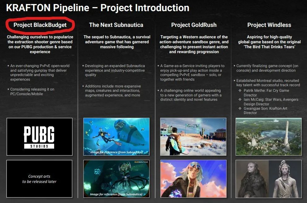 所以Krafton瞄准了下一个“爆款”,那就是被称为“塔科夫”式游戏的撤离类射击游戏。目前Krafton公布PUBG工作室正在研发一个叫“Project BlackBudget”的项目。他们表示“正在挑战自己,根据之前《绝地求生》的开发和运营经验让撤离类射击游戏像之前吃鸡游戏那样火起来”。同时他们表示这款游戏将会包含“一个不断变化的PvPvE开放世界以及让人满意的枪战玩法”, 让玩家拥有难以预料的开心体验。目前他们考虑让这款游戏横跨电脑、主机以及手机三大端口,多平台上线。截止目前,他们并未公布这些新作的上线日期,甚至在报告上也没透露项目的概念图。