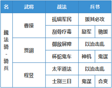 替代:战法方面曹操、程昱没有太多的变动,基本在同类战法里找替代即可(如士别三日没有,可以用兵无常势、四面楚歌等输出战法替代)。贾诩身上的两个战法位可以替换的战法就比较多了:夺魂挟魄、兵无常势、御敌屏障、杯蛇鬼车、伪书相间、象兵……都是不错的选择。此外,这一队用不用象兵比较见仁见智,虽然象兵也非常优秀,但因为灼烧在正面战场上还是非常多的,带了象兵等于给这队本来很稳定的队伍增添了一些不稳定性,所以大丹自己的话,觉得直接用减伤战法会更好,没有多余的减伤直接用象兵也不错。武将的替代,可以用任意魏国S适性骑兵武将补位(强度也会对应下降)。
