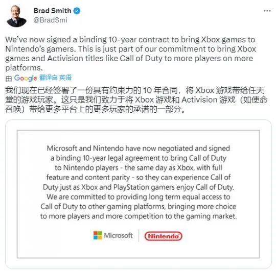 过去,任天堂与其他平台在主机游戏方面鲜有合作,但在近期这种情况却发生了变化。微软总裁Brad Smith就在今日宣布,微软已跟任天堂签署了一份为期10年的合同,承诺将把《使命召唤》系列带给任天堂玩家,游戏功能、内容都与Xbox版本完全相同。