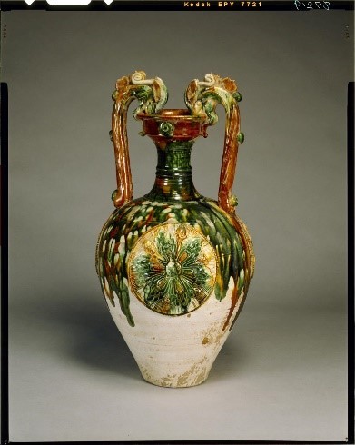 此瓶体三面贴饰有宝相华纹浮雕图案,龙头咬住瓶口两侧又与瓶身相连,构成耳状,故称为龙耳瓶。瓶身采用彩色贴花工艺,体现出浓郁的波斯审美风格。唐三彩,指的是中国唐代陶器上的釉色,因此类器物最早、最多出土于洛阳,所以也有“洛阳唐三彩”的说法。
