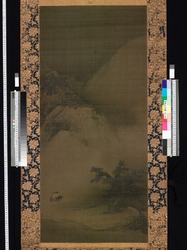 梁楷是名满中日的南宋画家,曾于南宋宁宗期间担任画院待诏。善画山水、佛道和鬼神。又性好饮酒,且酒后的行为不拘礼法,故被称为“梁风(疯)子”。图中描绘两位身着白色披风、头戴风雪帽的骑驴人穿行于山谷间。水边生长有两棵枝干虬曲的老树。远处的密林和山体在淡墨渲染的天空映衬下给人以空阔感,整个画面呈现出荒凉萧瑟的氛围,堪称南宋院体山水画的经典之作。此画也被誉为“日本国宝”之一。