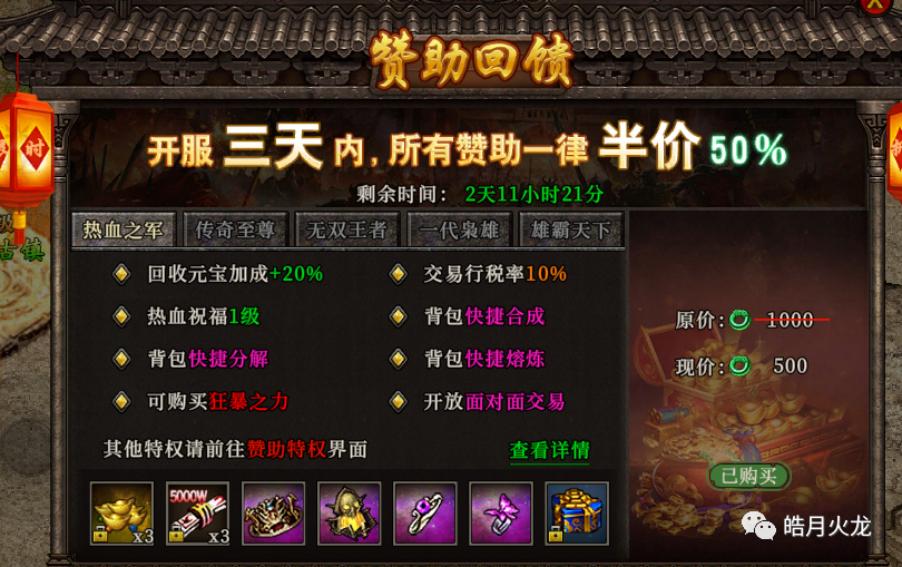 最重要的是开服三天内,所有赞助都半价,顶赞原价3900,现在只要1950就能拿到顶赞的很多特权