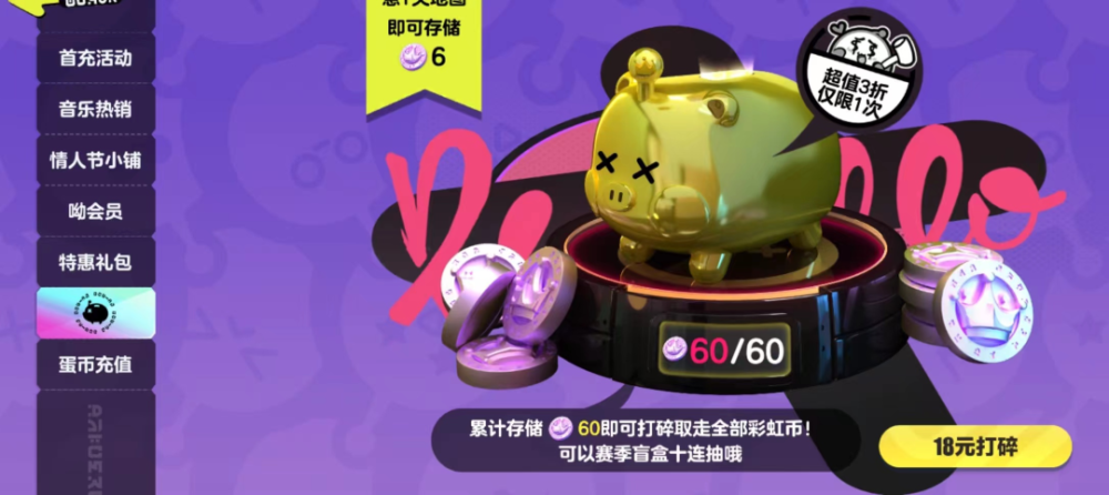 这时候就可以去买彩虹日礼包了,这个礼包每天都能买一次,最多累计7天。花70蛋币在彩虹日这里就能换到23个彩虹币了。接着打开彩虹存钱罐,花18元拿下它。