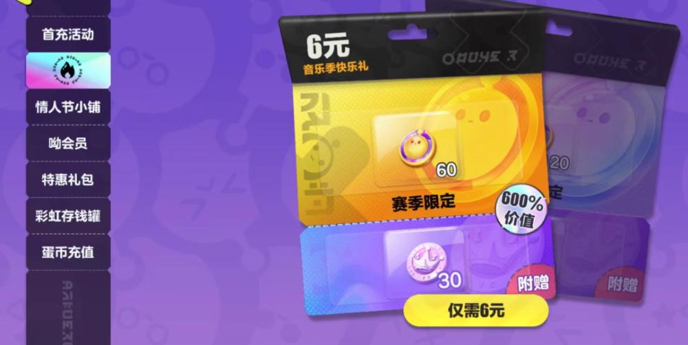 点开热销,咱们先把6元和12元的音乐季快乐礼拿下,现在就有了180个蛋币和60个彩虹币。