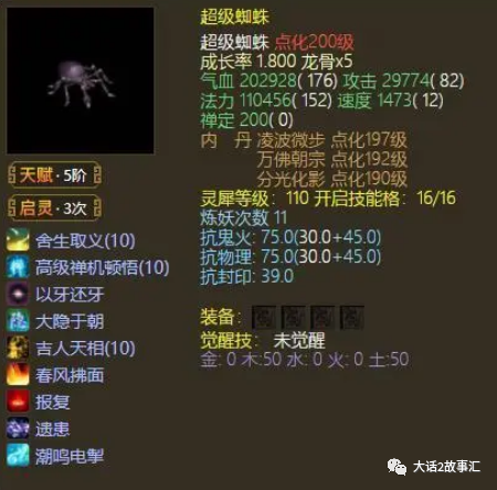 说了大半天,还没提到神兽蜘蛛为什么被土豪们认可,其实最大的原因就是它自身的五行设定,木、土各50就意味着它可以同时领悟隐身技能还能直接领悟到舍生取义,而且在此基础上并不需要通过“五行决”来改变五行,这就等于节省了一个技能栏。而神兽当中拥有这种五行搭配的种类貌似只有蜘蛛!