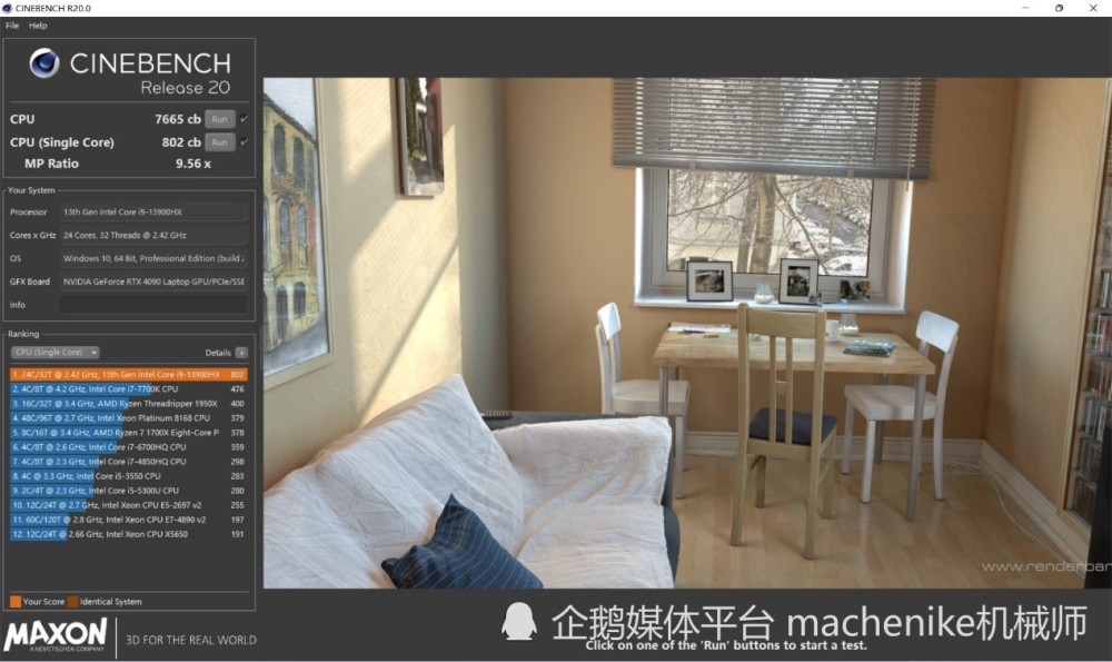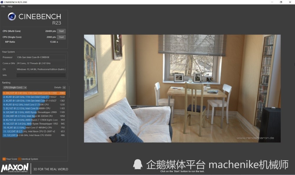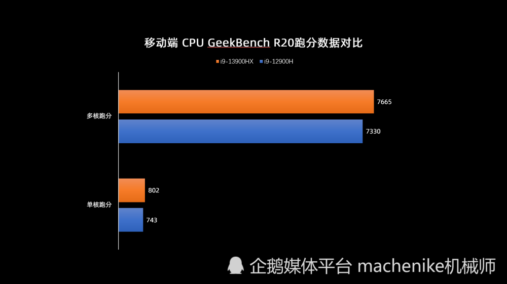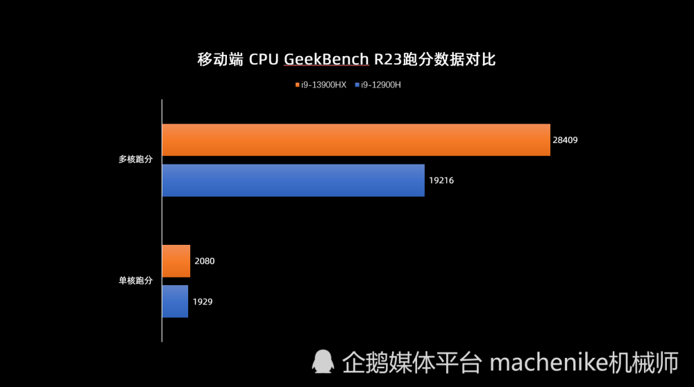 在R20、R23测试软件中,分别获得了R20单核802分、多核7665分、R23单核2080分、28409分,对比上一代移动端的i9-12900H处理器,有26.9%的性能提升。