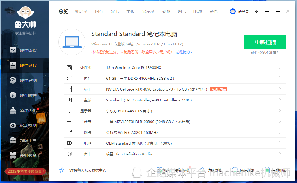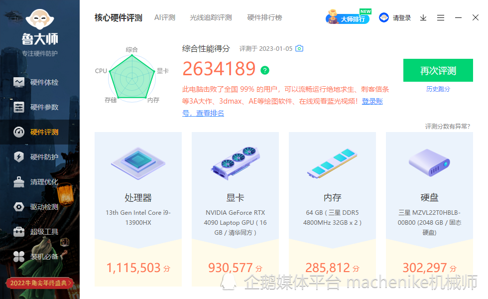 在配置方面,今年曙光16Pro会发布多个13代英特尔处理、RTX40系显卡的机型。这次测试机是i9-13900HX处理器、RTX4090显卡,64GB DDR5内存支持内存超频,三星2TB固态,从鲁大师的配置检测上,看到基本上所有的硬件都属于游戏本行业的顶配配置。