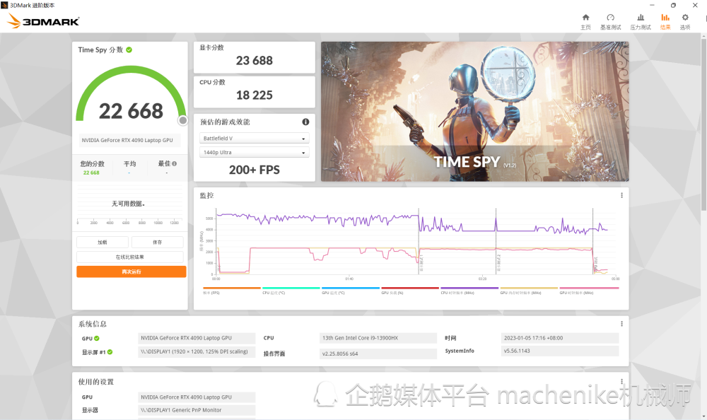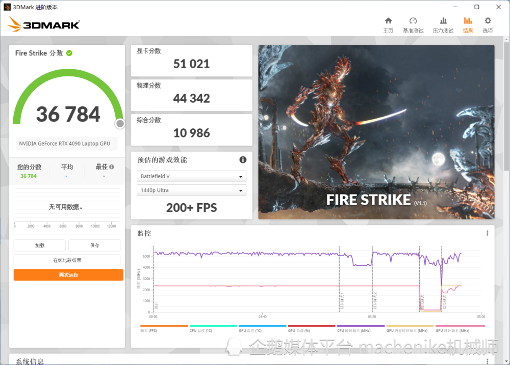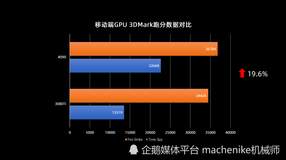 对比上一代移动端的RTX3080Ti 175W,3DMARK 的Time Spy(13519)? 测试和Fire Strike(34426)测试,综合性能提升大概19.6%。