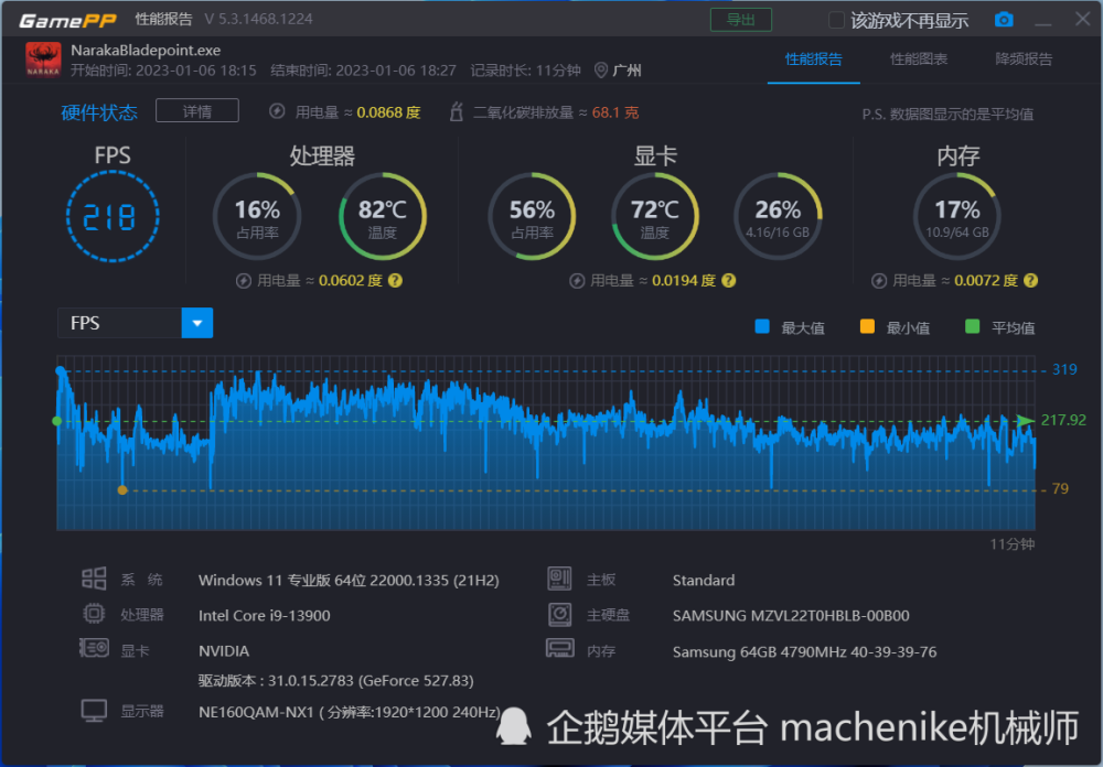在《永劫无间》游戏中,设定完最高画质后,跑了一段时间,平均帧数保持在218FPS,像永劫无间这类网游,这个帧数绝对够了。