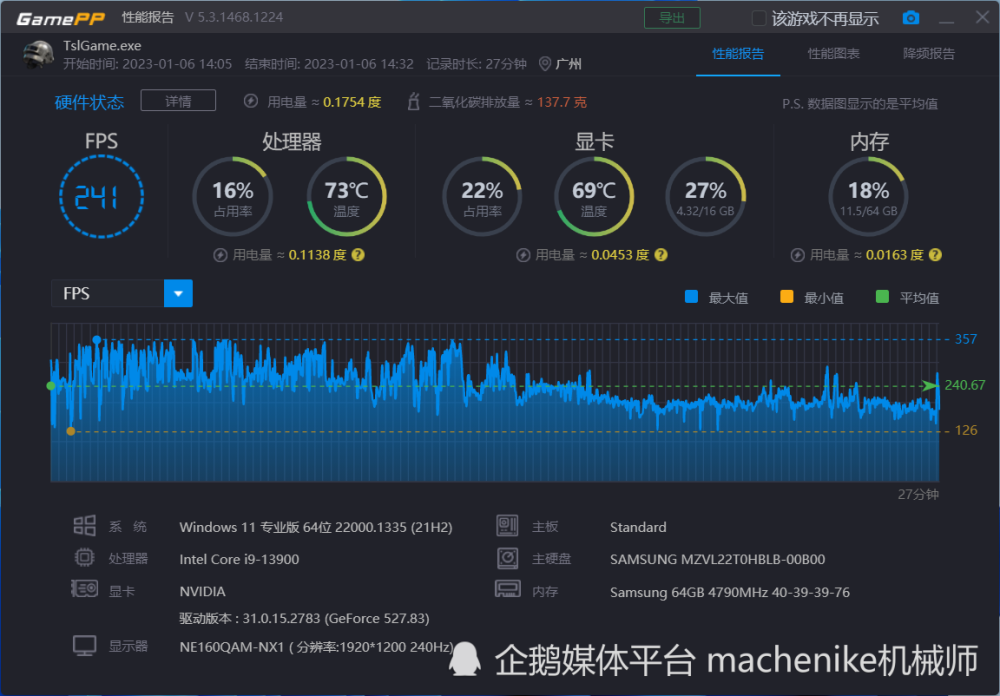 设定最高画质,试完了大概30分钟,平均帧数稳定在241FPS,最高帧数357帧,最低也在126帧,整体玩下来没什么问题。