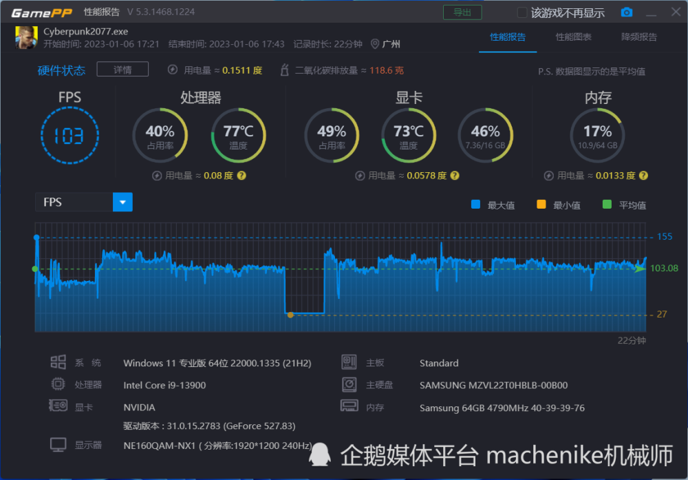 在《赛博朋克2077》游戏中,设定完最高画质后,跑了一段时间,平均帧数保持在103FPS,对比RTX3080Ti显卡,的73FPS,多了30FPS,游戏稳定性体验感是毫无问题的。