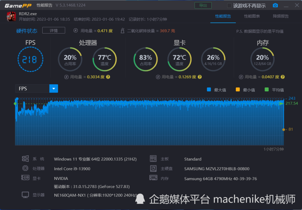 《荒野大镖客2》,也是设定完最高画质后,平均帧数也是稳定在了218FPS。整个测试过程的帧数,可以说是非常的平稳,卡顿是不存在的。