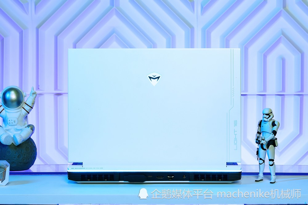 机械师曙光16pro 的A面采用铝合金材质打造,纯白配色很有质感,流线型设计时尚感十足,机身规格357.24x270.32x28.75mm,约2.49kg的重量,重量尺寸和常见的游戏本基本保持一致。