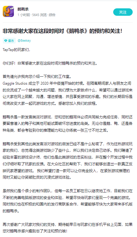 今日,《鹅鸭杀》官方入驻 TapTap并开放国服移动端预约,开发团队表示在日以继夜地工作,不断完善 PC 版游戏的安全和体验,在积极地和国内发行商联系、合作,感谢玩家对游戏的支持,“期待能早日与玩家们在手机平台上见面。”