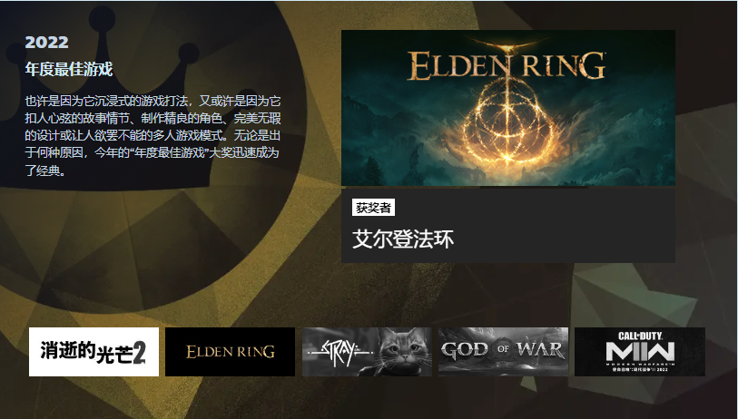 2022 年 Steam 大奖结果出炉,《艾尔登法环》获得年度最佳游戏、纵使手残仍大爱奖,《赛博朋克 2077》获得爱的付出奖。