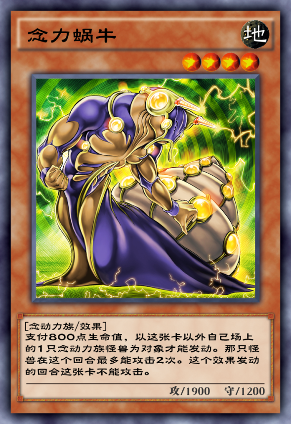 第二张念力蜗牛主要适配念动力本家的怪兽,通过支付800生命值让这张卡之外的自家念动力怪兽在一回合内攻击两次,属于比较给力的斩杀适配卡,不过现在念动力体系除三星同调外强度并不乐观,所以并不适用于实战。