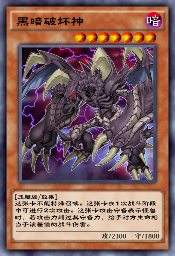 在来势汹汹的稀有卡猎手活动中,奖励卡是这张七星怪兽黑暗破坏神。说实话这张卡的作用可能并不是特别显著,目前能想到的就是在特化恶魔卡组中使用。这张卡最大的弊端在于不能特殊召唤,不过效果还是很强的,本身自带穿防而且还可以在战斗阶段中进行两次攻击,虽然攻击力只有2300,不过却有着能OTK对手的潜力,在一些特化娱乐构筑中可能比较好玩。