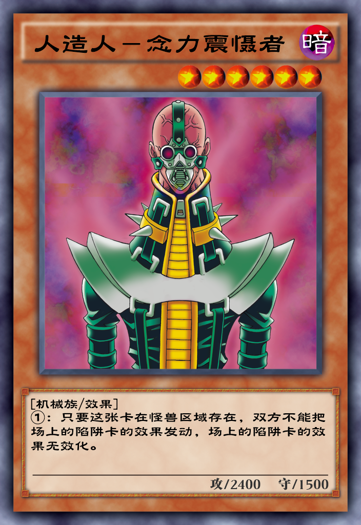 接下来我们要说的就是游戏中的重头戏了,这次的吕场活动我们可以获取到人造人这一早期环境中相当霸道的单卡,这张卡被国服压了这么久才放出来也是有原因的。本身机械族的特点能够适配古代机械、机甲等诸多体系,同时这张卡的效果可以在怪兽区存在的情况下,双方不能把场上陷阱卡的效果发动,且场上的陷阱卡效果无效化!直接封禁陷阱的强势效果能让破坏剑等一众卡组拥有出头之日,不仅如此人造人的强势之处在于让陷阱卡不能发动,就算是虫妹的陷阱保护也完全无效,在人造人面前虫惑魔体系很容易被一卡单刷。