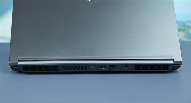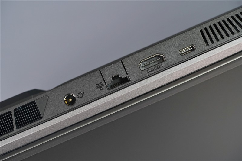 机身后侧部分,分别为电源输入口、RJ45以太网口、HDMI 2.1视频输出、USB-C 3.2 Gen2(可支持DP 1.4视频输出)。