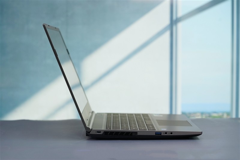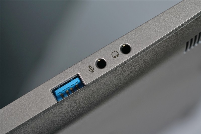 机身左侧部分,分别为USB-A 3.1 Gen2、3.5mm音频输出和输入插孔。