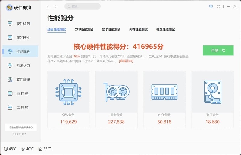 其中CPU分数为119629,图形分数是227838,内存分数50818,硬盘分数18680。