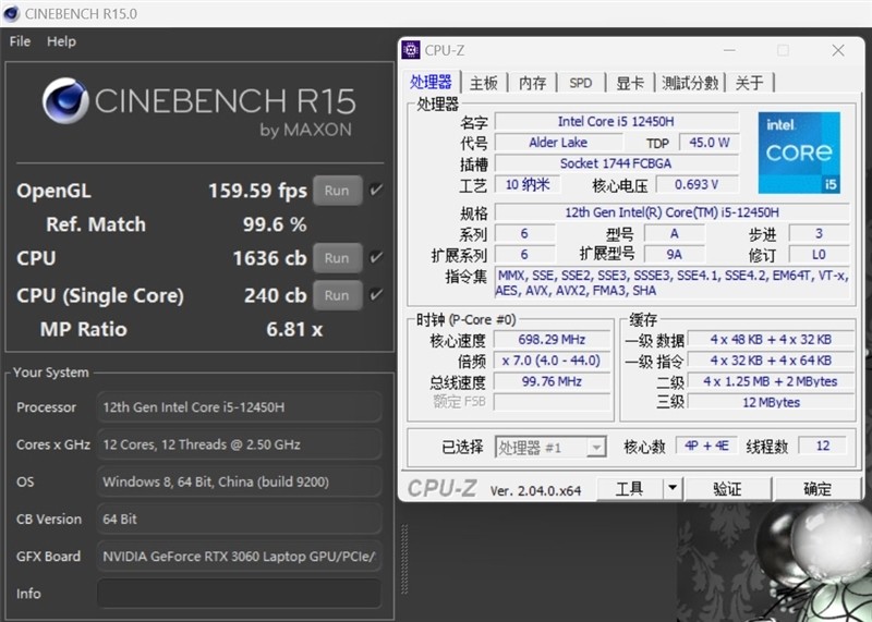 在CINEBENCH R20测试中,酷睿i5-12450H单线程分数为240,多线程为1636。