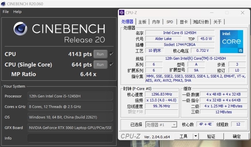 在CINEBENCH R23测试中,酷睿i5-12450H单线程分数为644,多线程为4143。