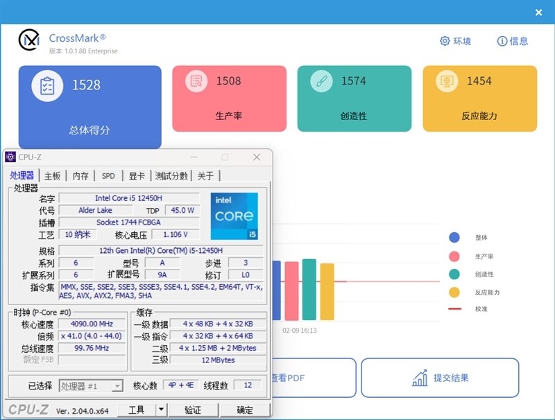 酷睿i5-12450H在CrossMark中总体得分为1528,其中生产率为1508、创造性为1574、反应能力为1454。
