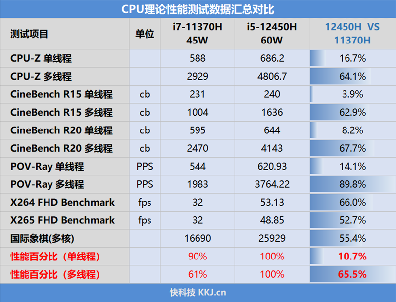 对比已有相关数据对,酷睿i5-12450H凭借60W的超高性能释放,整体性能自然是大大超过45W标准性能释放的11代酷睿i7-11370H。