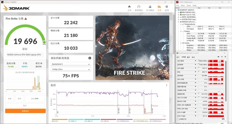 在测试期间,RTX 3060 Laptop显卡频率最高为2002MHz,功耗最高为138W,最高温度为79摄氏度。