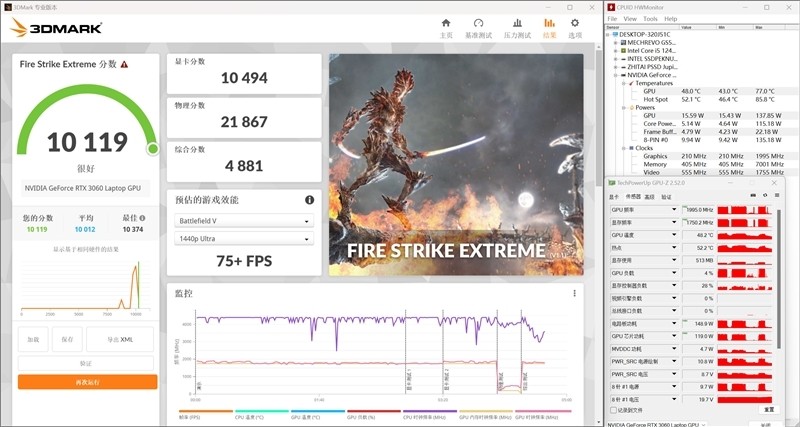 在测试期间,RTX 3060 Laptop显卡频率最高为1995MHz,功耗最高为138W,最高温度为77摄氏度。