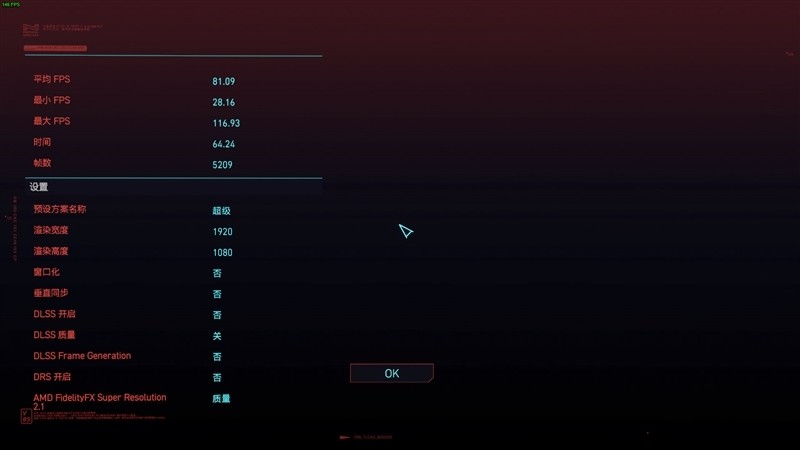 在《赛博朋克2077》1080P+预设超级画质下,平均帧数为81.09 FPS。