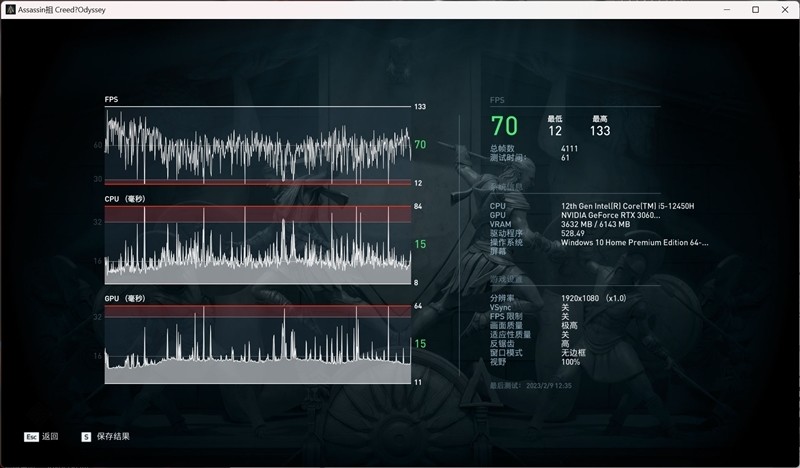 在《刺客信条:奥德赛》1080P+预设极高画质下,平均帧数为70 FPS。