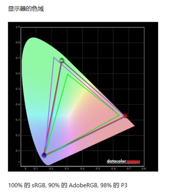 通过校色仪实测,机械革命极光Pro笔记本的屏幕覆盖了100%的sRGB色域、90%的Adobe RGB色域、98%的P3色域。