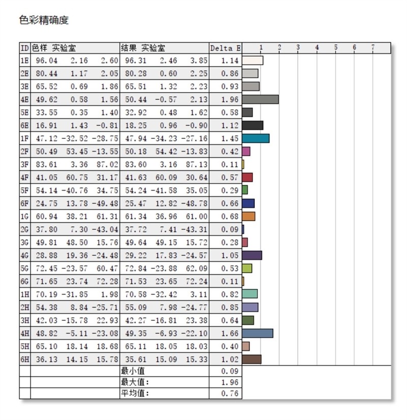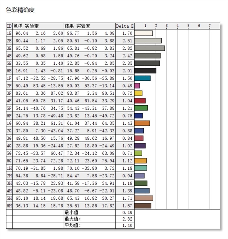 在色彩精准度上,实测Delta-E最大值为2.82,最低值为0.49,平均为1.4,还是比较优异的。