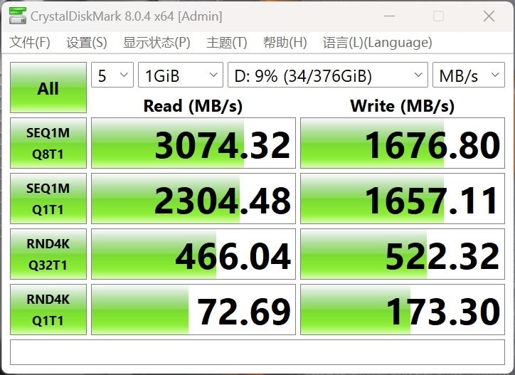 机械革命极光Pro笔记本搭载的512GB NVMe SSD,在CrystalDiskMark测试中,在顺序上可实现3.1GB/s的读取、1.7GB/s的写入速度,4K随机也有着73MB/s的读取、173MB/s的写入表现。