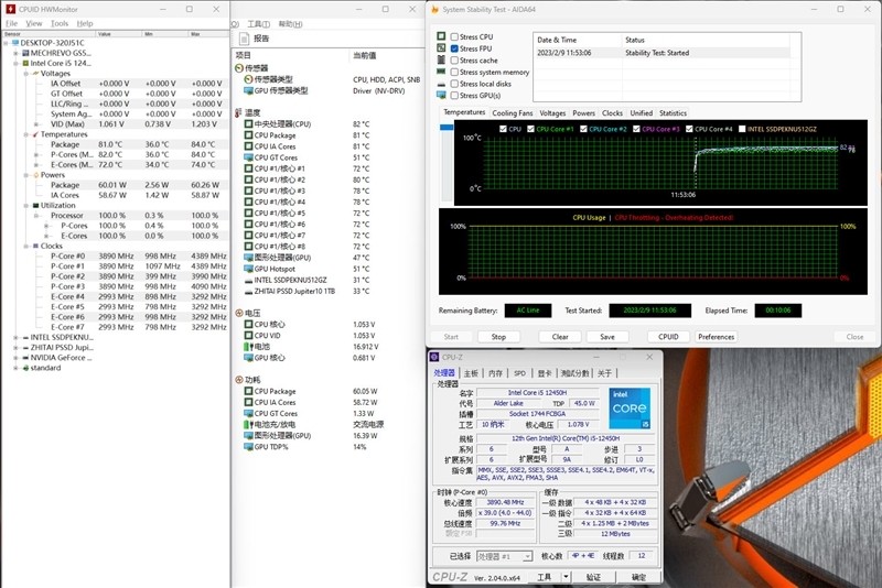 使用AIDA64进行FPU烤机10分钟后,酷睿i5-12450H功率稳定在60W左右,符合宣传,P核频率在3.9GHz,E核频率在3GHz,温度在81摄氏度。