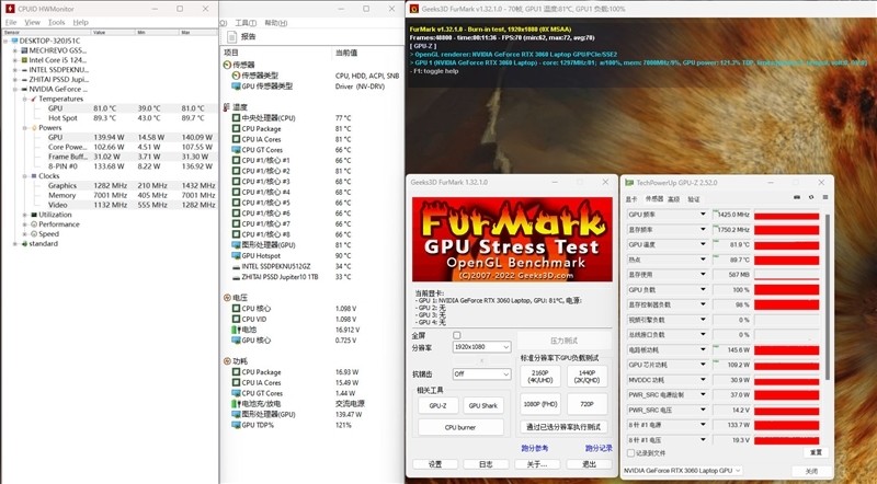 使用FurMark,分辨率选择1080P,10分钟后,RTX 3060 Laptop显卡频率在1382MHz,温度最高为81℃,功耗就达到了140W。