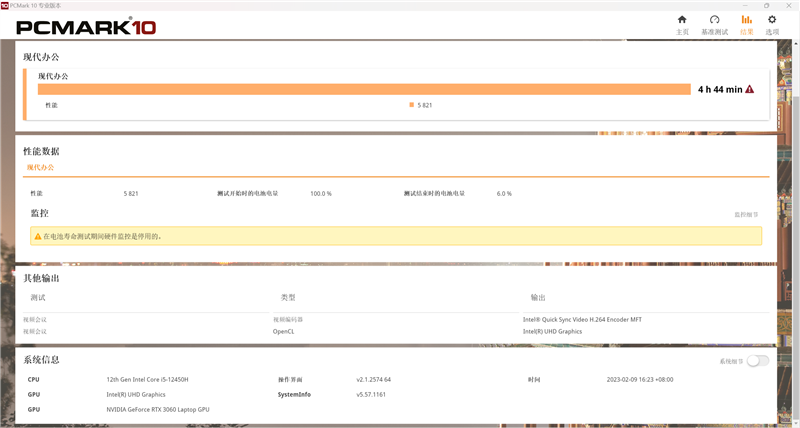 内置了一块容量为62.32Wh容量的锂电池,我们使用PCMark 10来实际测试一下这款笔记本的续航能力。