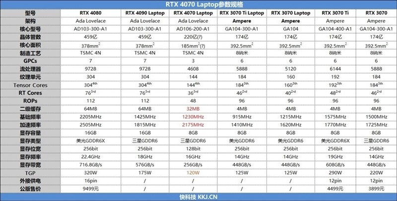 从参数上看,似乎比上代的RTX 3070 Ti Laptop要差了不少,特别是流处理器数量少了1280个,显存位宽直接砍半到128Bit。
