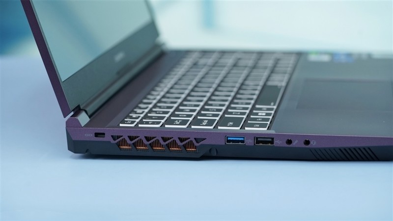 机身左侧有一个USB 3.2 Gen1接口、1个USB 2.0接口,2个3.5mm音频接口,最右边是散热出风口。