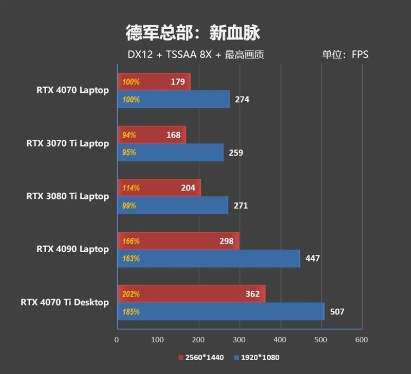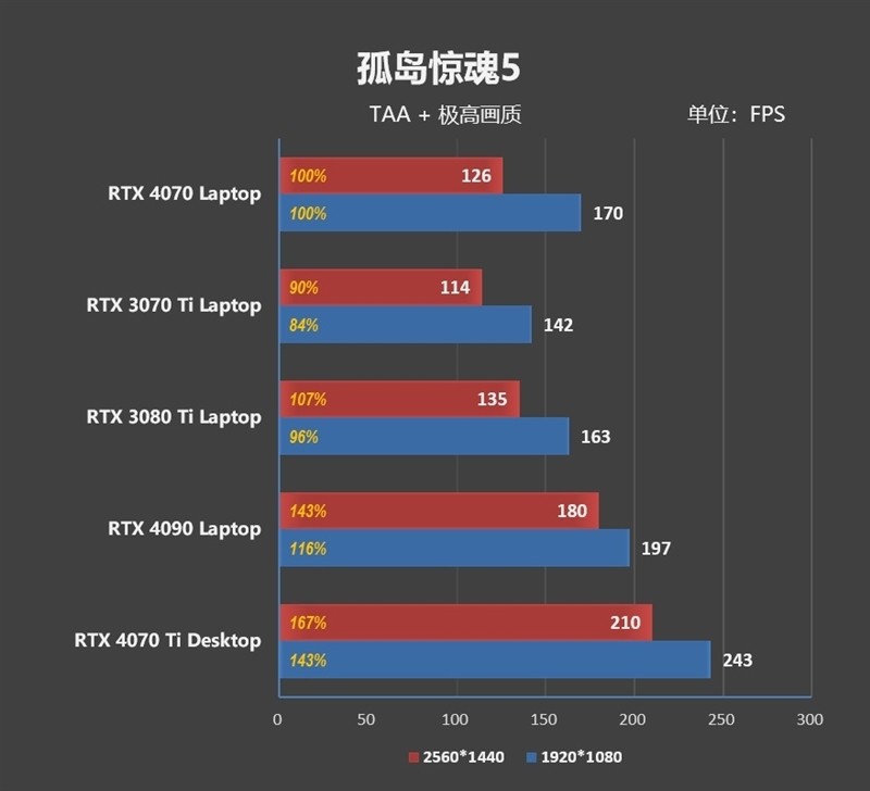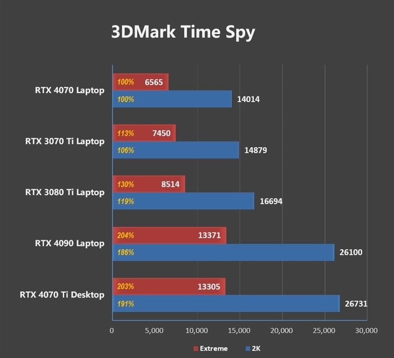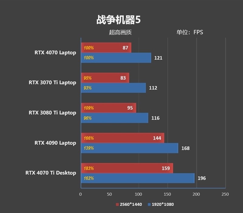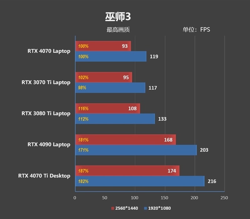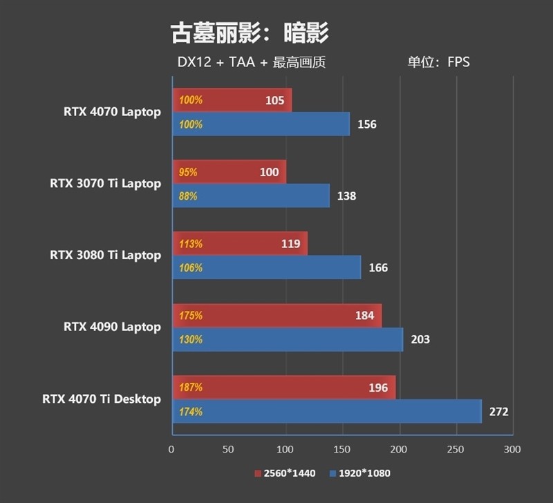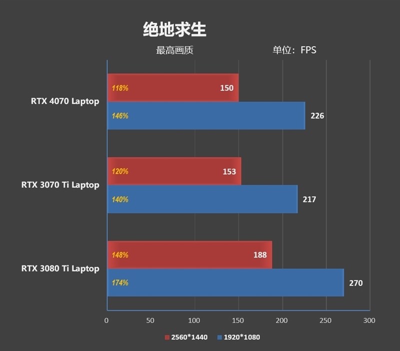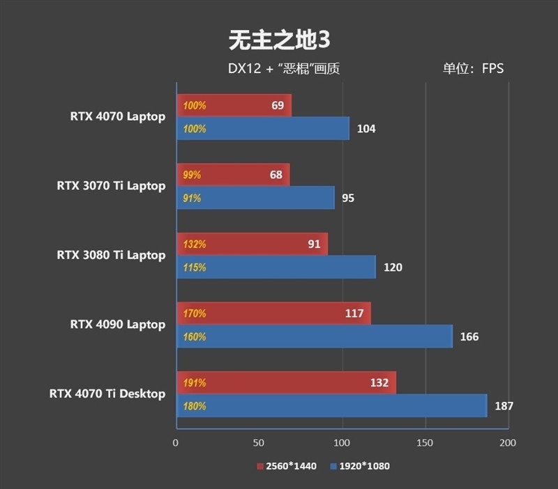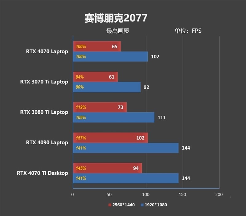 在1080P分辨率下,RTX 4070 Laptop比RTX 3070 Ti Laptop要强了9%左右。2K分辨率,领先优势缩小到了3%。